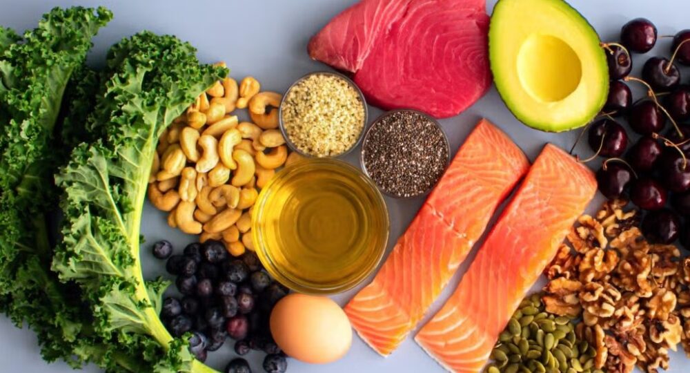 • Healthy Fats: Olive oil, avocado, seeds, and fatty fish contribute to heart and brain health.